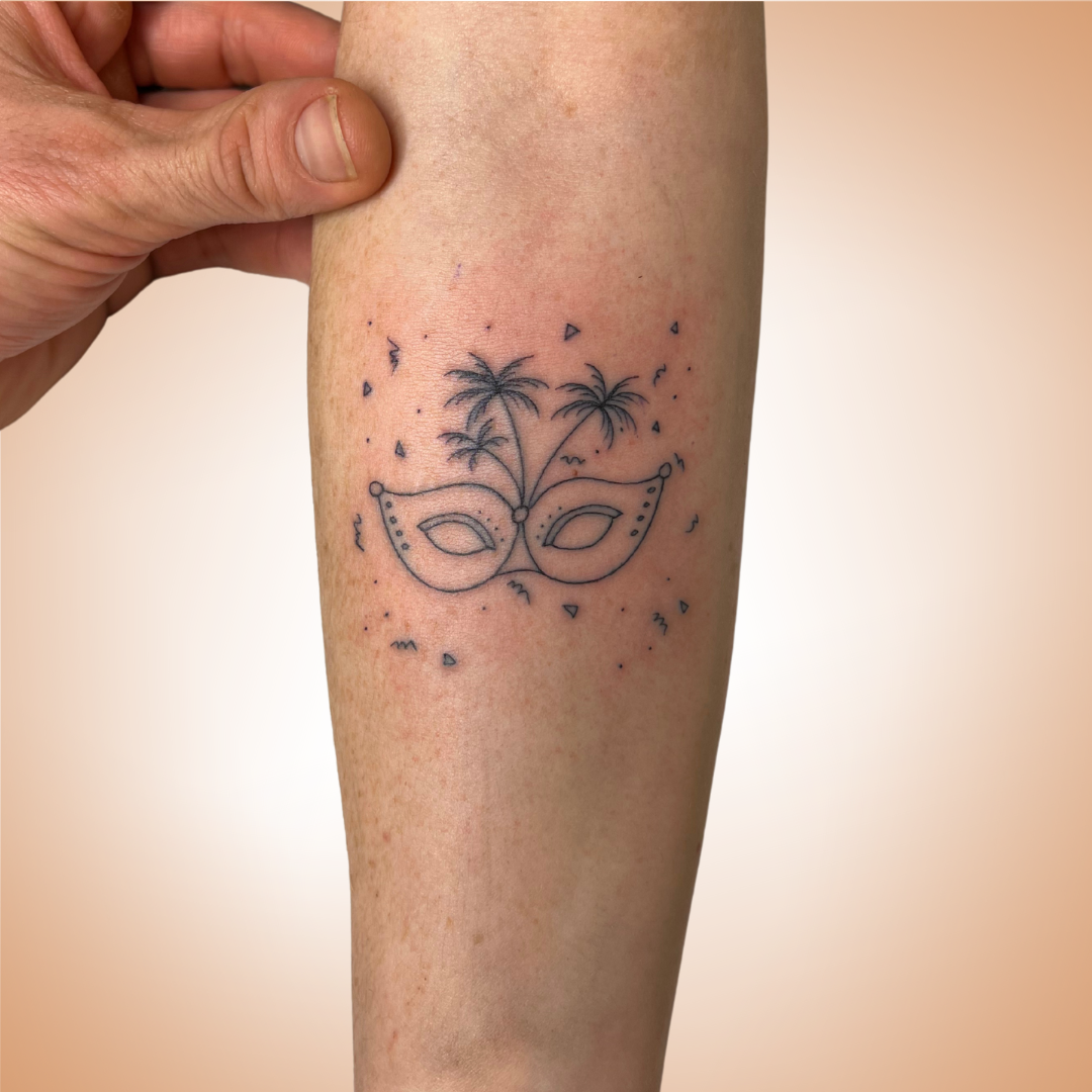 Inspiré du carnaval de Nice, ce tatouage représente un masque festif et élégant, symbole de joie et de tradition. Il peut être porté seul pour affirmer un style unique, ou associé à un autre masque de la collection pour créer un duo harmonieux, idéal pour un projet commun.