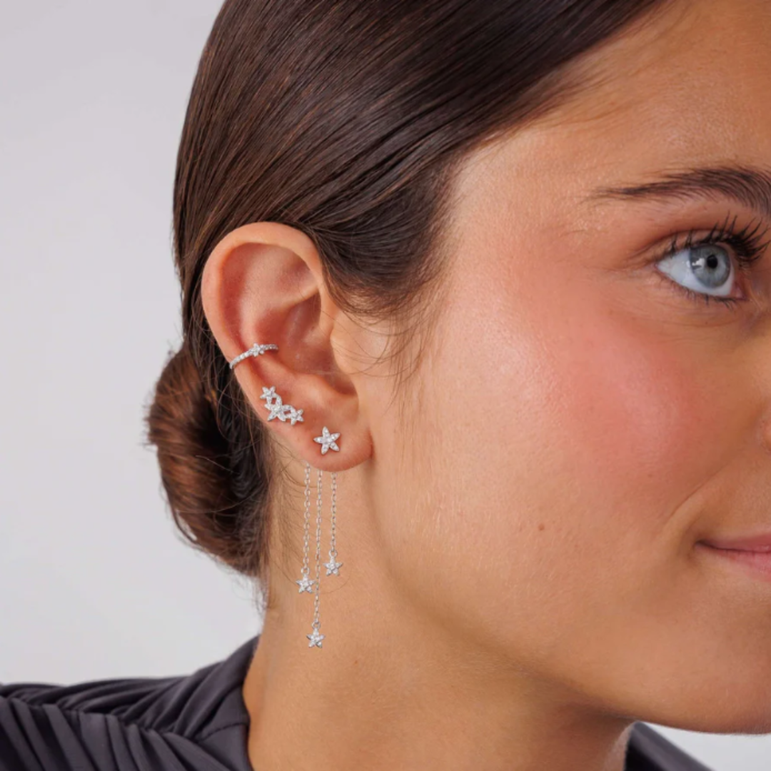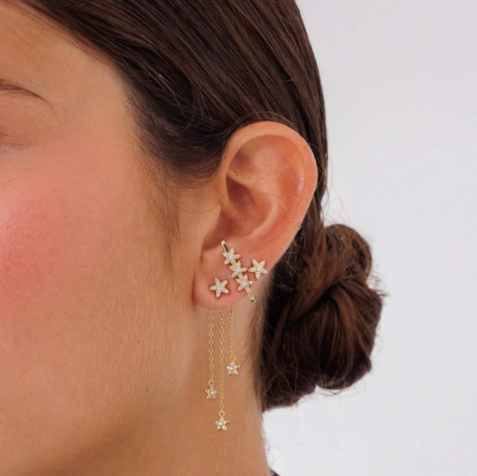 Une boucle à trois fines chaînettes ornées de délicates fleurs qui apporte une légère élégance et un mouvement discret. Ce bijou se porte au Lobe.