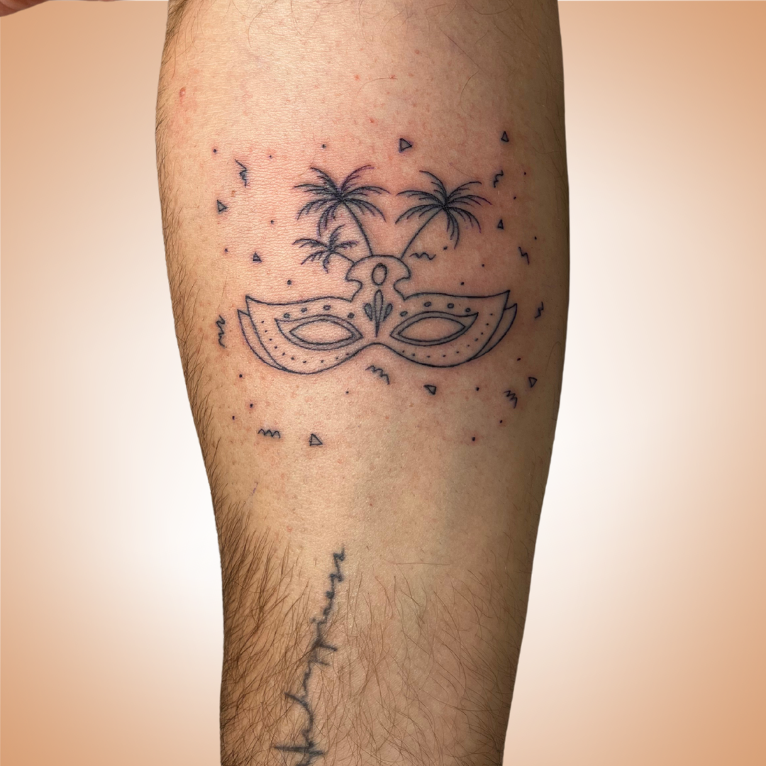 Inspiré du carnaval de Nice, ce tatouage représente un masque festif et élégant, symbole de joie et de tradition. Il peut être porté seul pour affirmer un style unique, ou associé à un autre masque de la collection pour créer un duo harmonieux, idéal pour un projet commun.